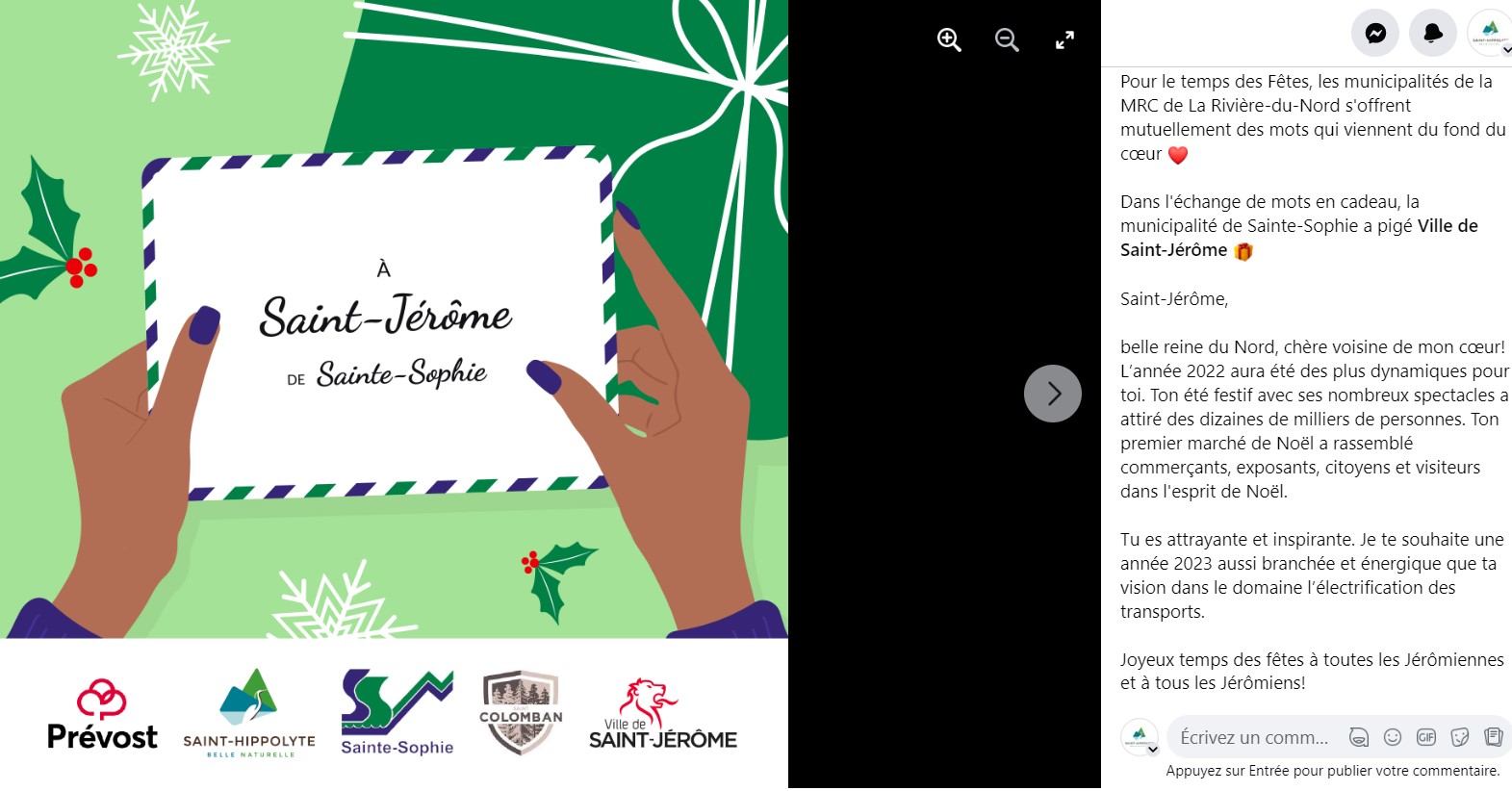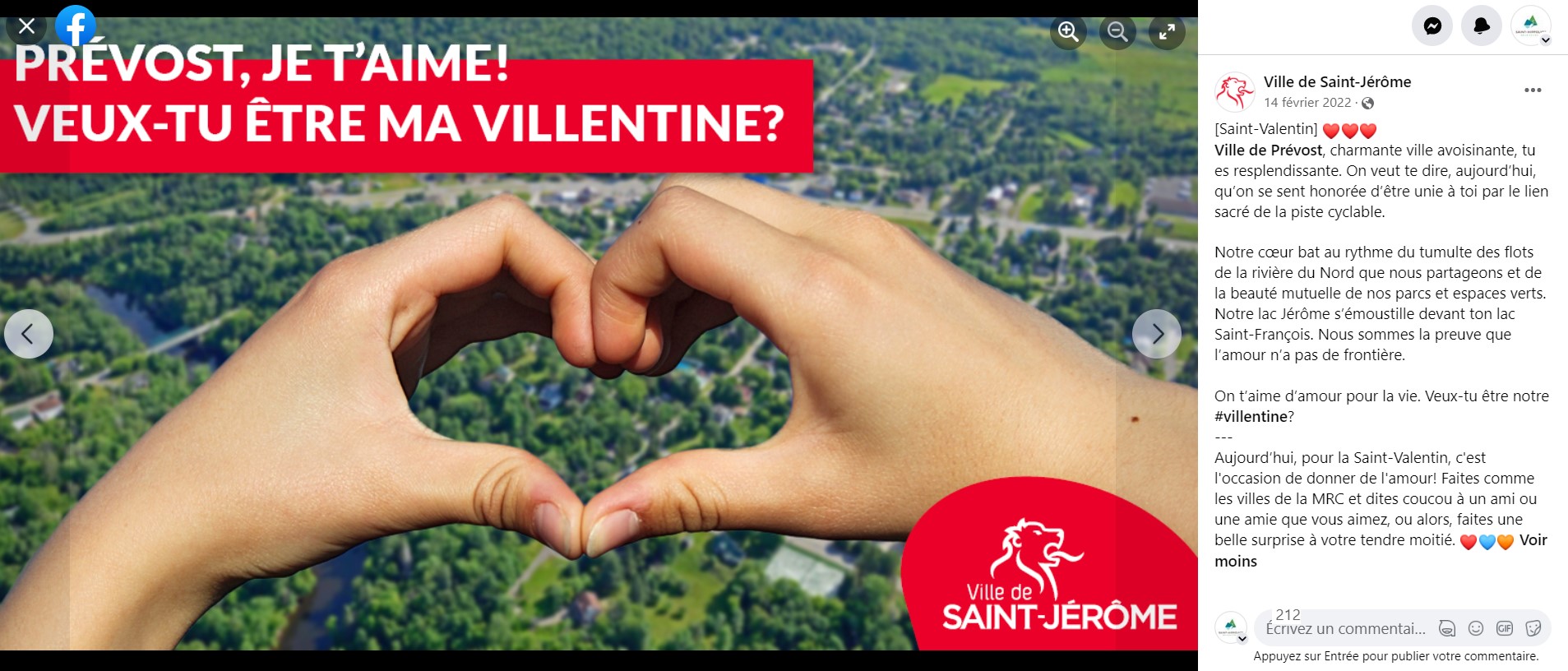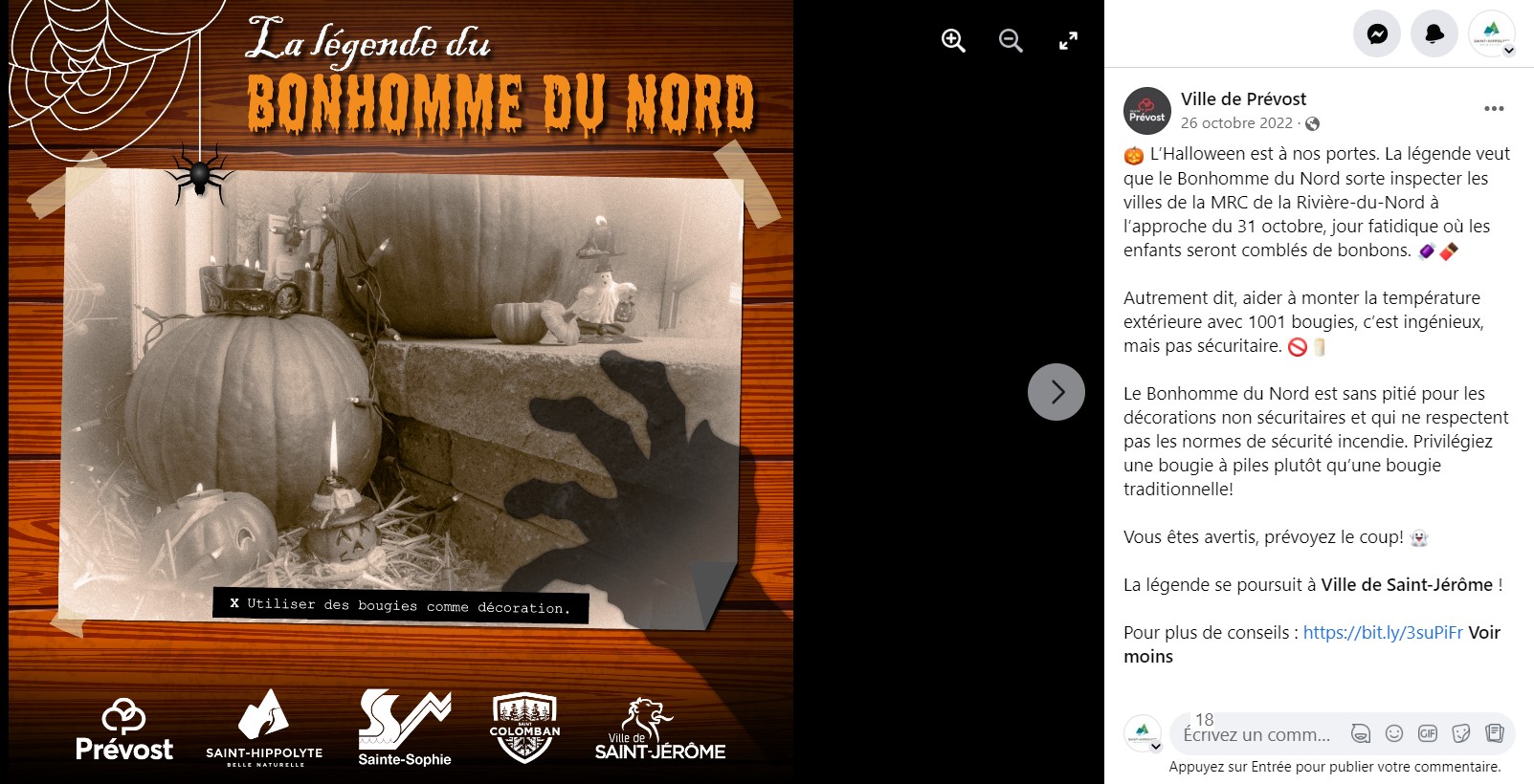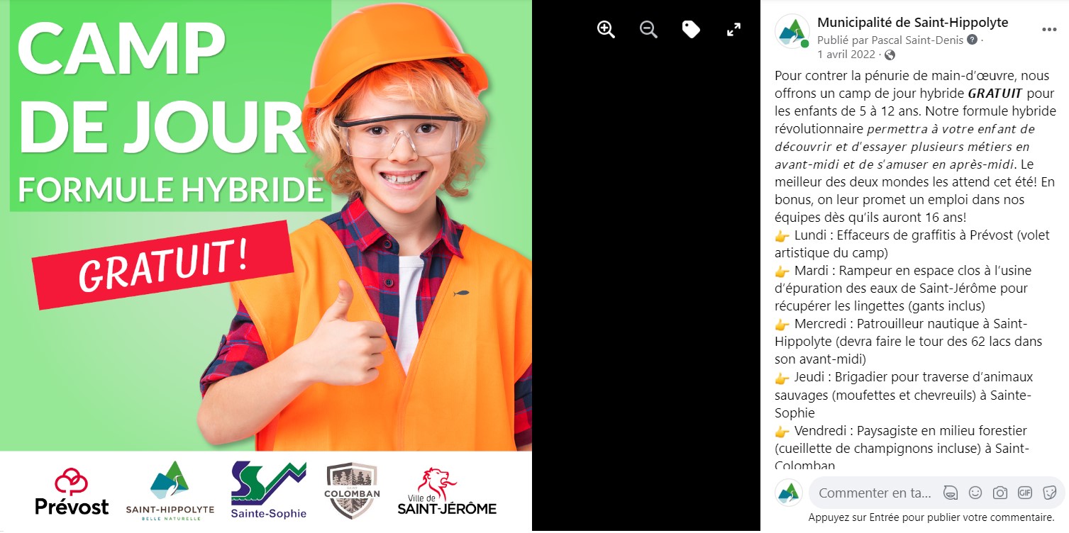 Le projet de collaboration Facebook intermunicipale avait pour objectif de créer des collaborations sympathiques entre communicateurs municipaux de la MRC de La Rivière-du-Nord lors de quatre événements populaires : Saint-Valentin, poisson d’avril, Halloween et le temps des Fêtes.