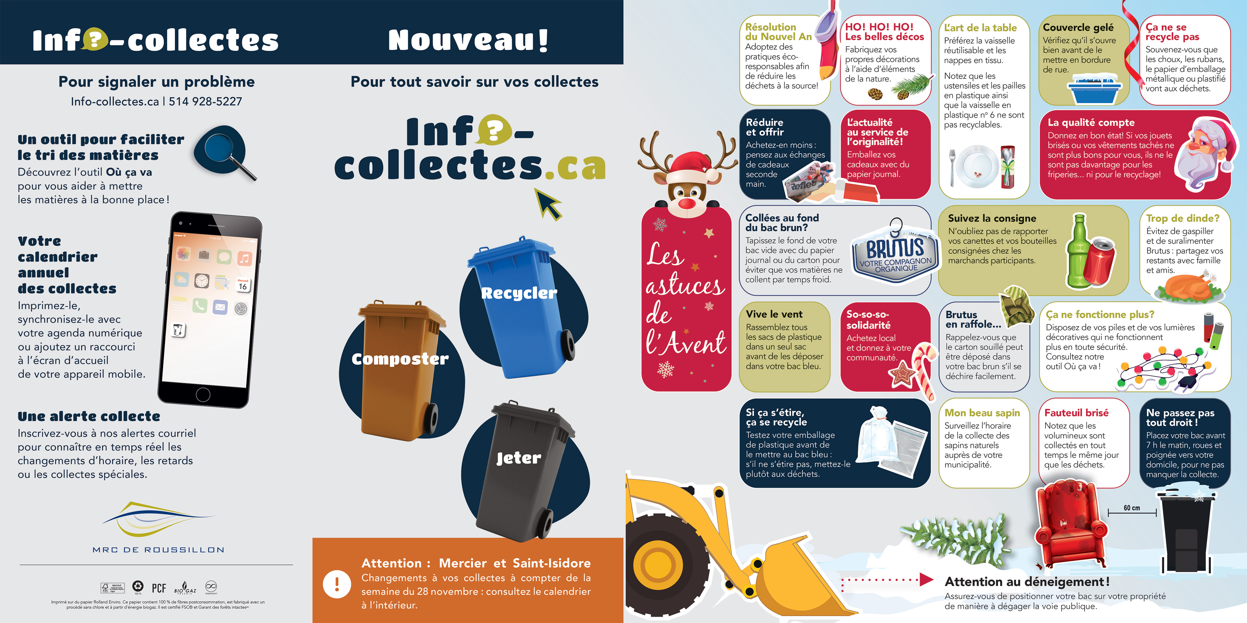 Le site info-collectes.ca est un site dédié aux matières résiduelles et adapté aux besoins du citoyen. On y trouve l’information sur les collectes, le calendrier, un moteur de recherche facilitant le tri des matières ainsi que des conseils visant à réutiliser, recycler, composter et mieux consommer.